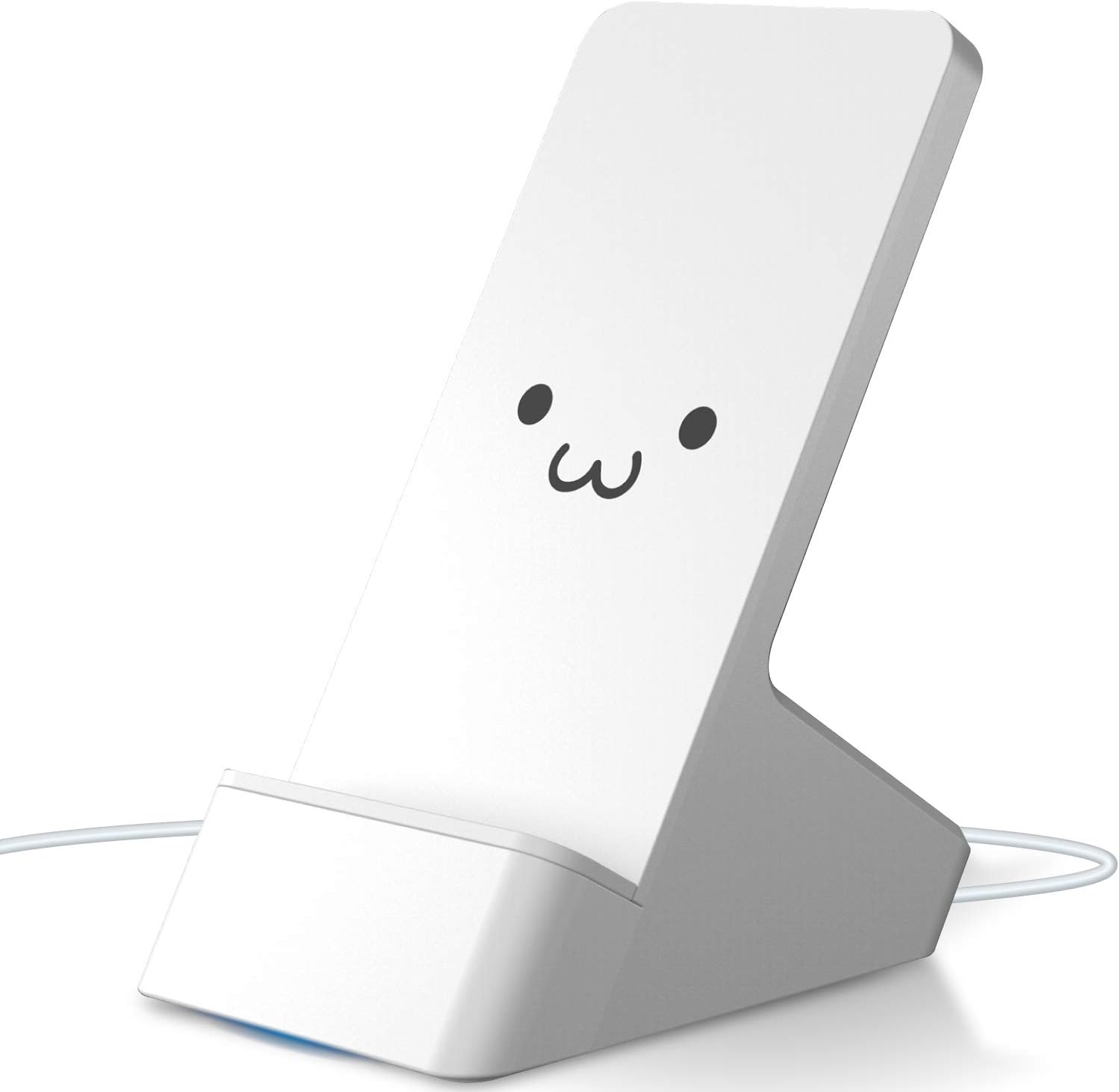 エレコム独自のフェイスマークがプリントされた10Wワイヤレス充電器。この謎顔はホワイト色の製品に多く,ブラック色にはほとんどプリントされていない。